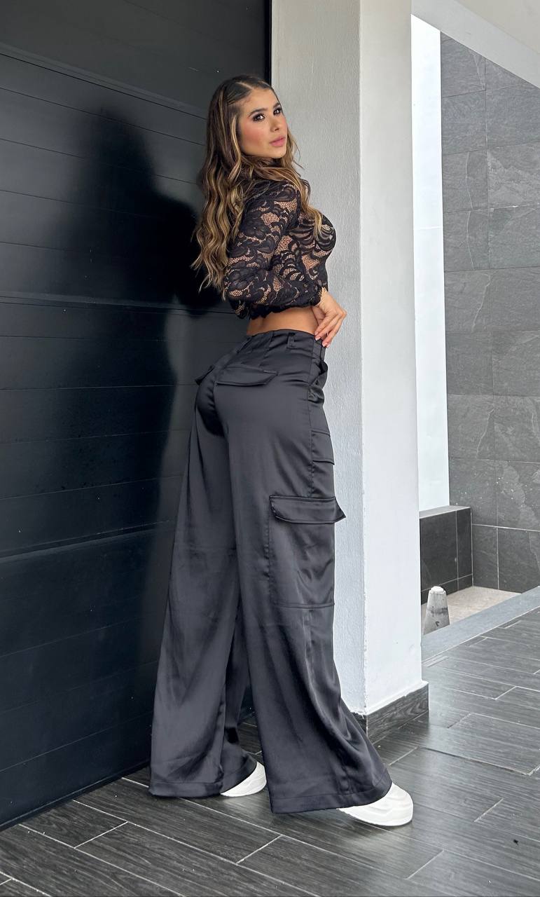 Descubre el Pantalón Cargo Negro que eleva cualquier look. Confeccionado en satén grueso, ofrece una caída espectacular y un tacto suave que te encantará